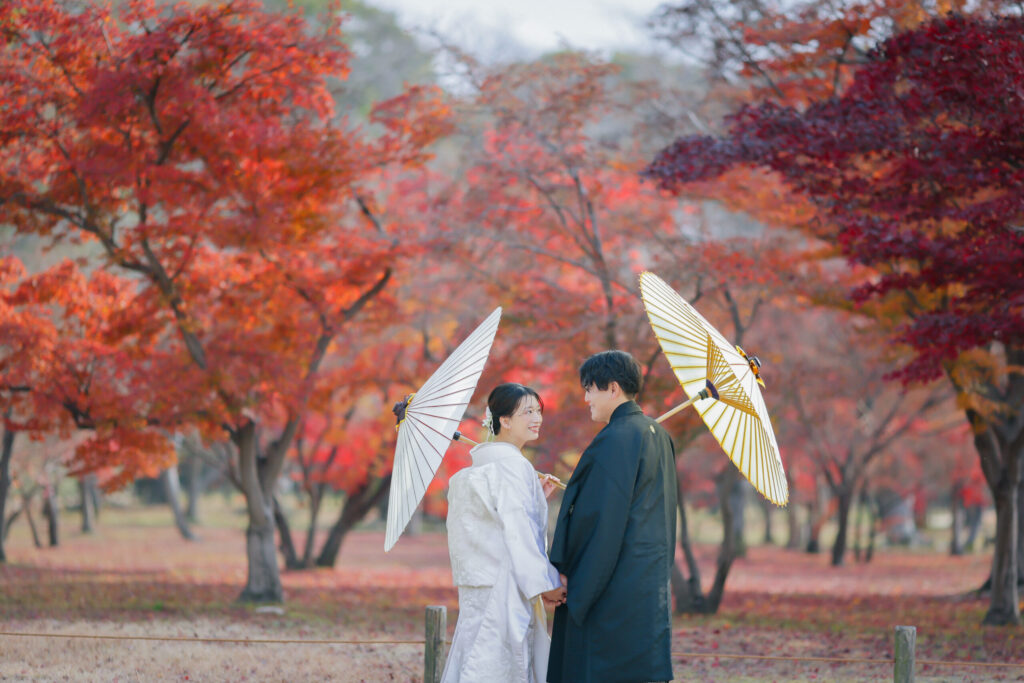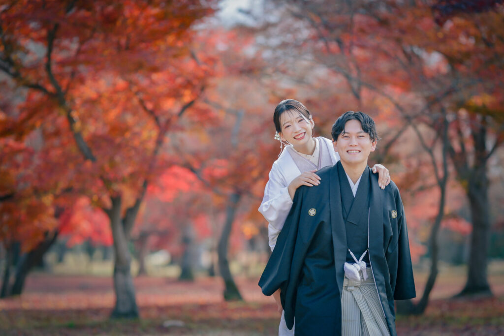 重なり合う紅葉の木々が写真に奥行きをもたらしてくれます。ふたりの仲の良さも伝わってくる素敵な1枚です。