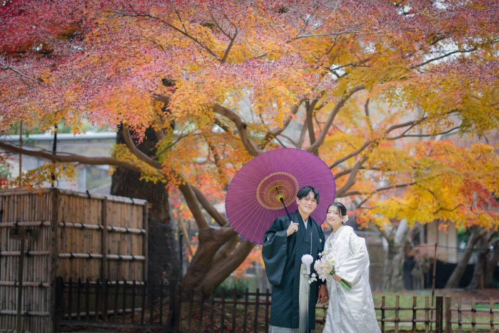 真っ赤に染まる紅葉の中での撮影*おふたりの和装も映えてとても素敵でした^^
