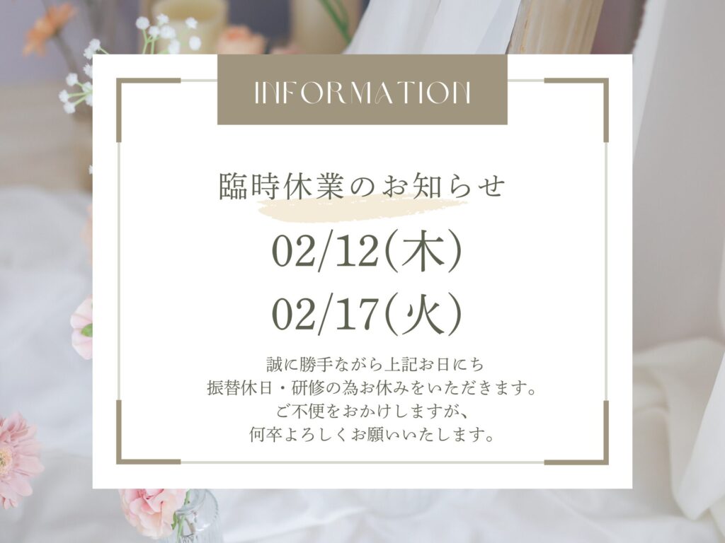 臨時休業のお知らせ 2026.02.11 平素よりスタジオビュー岡山本店をご利用いただき、誠にありがとうございます。勝手ながら、下記日程の営業日を変更させていただきます。 2月11日(水):通常営業 10:00-19:002月12日(木):振替休日 2月17日(火) :研修の為休日 お客様にはご不便をおかけいたしますが、何卒ご理解のほどよろしくお願い申し上げます。